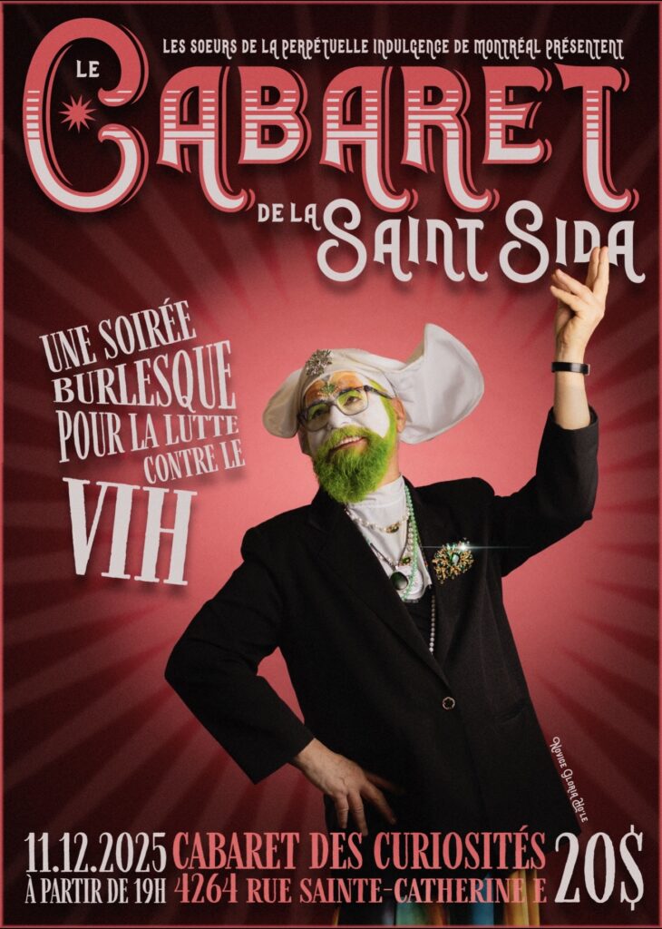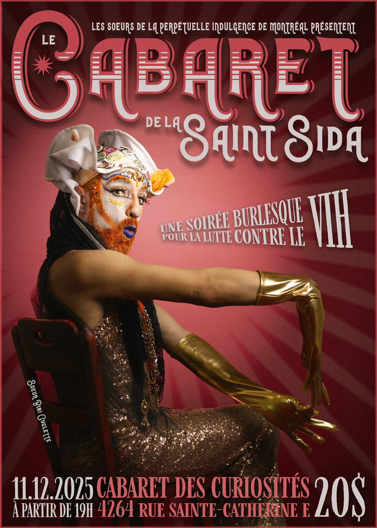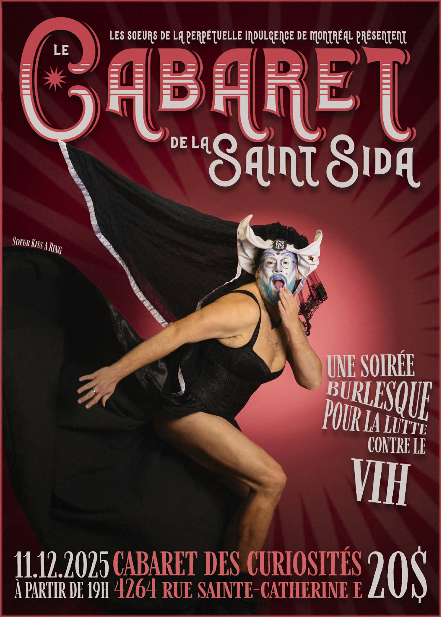 Affiche officielle du Cabaret de la Saint SIDA 2025. Crédit photo: Alexandre Cotton.Soeurs Lou Divine, BibiCyclette et Émile lors de la soirée Cabaret. Décembre 2025Soeur Kiss A Ring à l’animation lors de la soirée Cabaret. Crédit photo: Alexandre Cotton